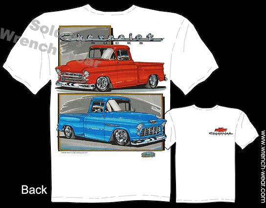 - 100% cotton Pick Up Clothing 55 56 57 Chevrolet Shirt is comfortable, durable, and preshrunk. - Silk screen artwork on this 1955 1956 1957 Chevy Truck T Shirt for detail and longevity. - Pick Up Clothing 55 56 57 Chevrolet Shirt design is on BACK. Small design on chest. - Color of 1955 1956 1957 Chevy Truck T Shirt is WHITE. - Buy American... Pick Up Clothing 55 56 57 Chevrolet Shirt is printed in the U.S. - 1955 1956 1957 Chevy Truck T Shirt brand varies... Hanes, Gilden, Fruit Of The Loom. - New Pick Up Clothing 55 56 57 Chevrolet Shirt arrives folded and bagged.1955 1956 1957 Chevy Truck T Shirt Description: