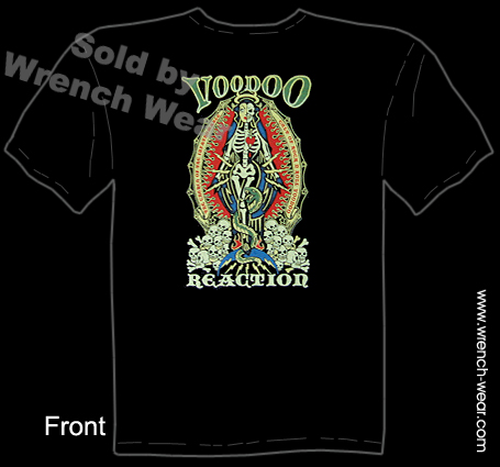 - 100% cotton Kustom Kulture Apparel Tee is comfortable, durable, and preshrunk. - Silk screen artwork on this Voodoo Reaction Tattoo T Shirt for detail and longevity. - Kustom Kulture Apparel Tee design is on FRONT. - Color of Voodoo Reaction Tattoo T Shirt is BLACK. - Buy American... Kustom Kulture Apparel Tee is printed in the U.S. - Voodoo Reaction Tattoo T Shirt brand varies... Hanes, Gilden, Fruit Of The Loom. - New Kustom Kulture Apparel Tee arrives folded and bagged.Voodoo Reaction Tattoo T Shirt Description: