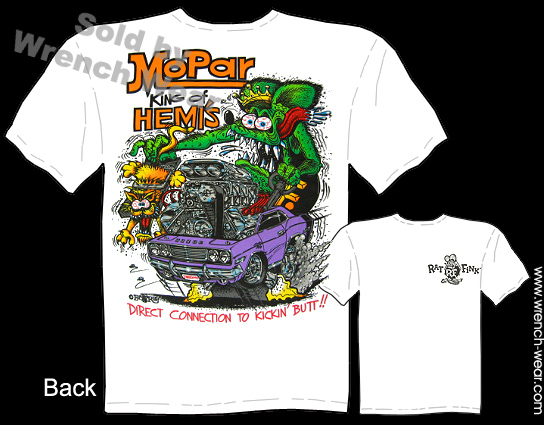- 100% cotton Mopar King Of HEMI'S Dodge T Shirt is comfortable, durable, and preshrunk. - Silk screen artwork on this Big Daddy Clothing Rat Fink T-shirt for detail and longevity. - Mopar King Of HEMI'S Dodge T Shirt design is on BACK. Small design on chest. - Color of Big Daddy Clothing Rat Fink T-shirt is WHITE. - Buy American... Mopar King Of HEMI'S Dodge T Shirt is printed in the U.S. - Big Daddy Clothing Rat Fink T-shirt brand varies... Hanes, Gilden, Fruit Of The Loom. - New Mopar King Of HEMI'S Dodge T Shirt arrives folded and bagged.Big Daddy Clothing Rat Fink T-shirt Description: