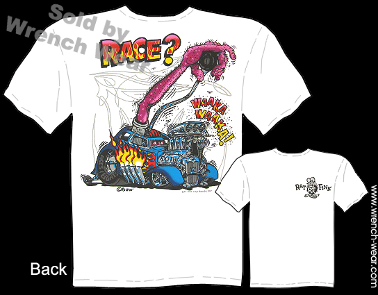 - 100% cotton Rat Fink Tee Shirt Ed Roth Clothing is comfortable, durable, and preshrunk. - Silk screen artwork on this Race? Big Daddy T Shirt Hot Rod Wear for detail and longevity. - Rat Fink Tee Shirt Ed Roth Clothing design is on BACK. Small design on chest. - Color of Race? Big Daddy T Shirt Hot Rod Wear is WHITE. - Buy American... Rat Fink Tee Shirt Ed Roth Clothing is printed in the U.S. - Race? Big Daddy T Shirt Hot Rod Wear brand varies... Hanes, Gilden, Fruit Of The Loom. - New Rat Fink Tee Shirt Ed Roth Clothing arrives folded and bagged.Race? Big Daddy T Shirt Hot Rod Wear Description: