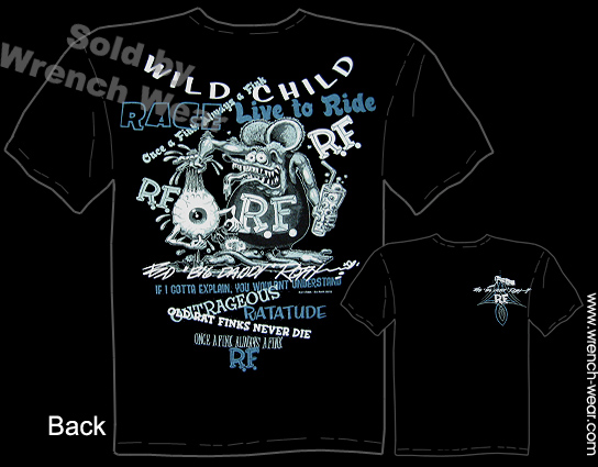 - 100% cotton Ratfink T Shirt Ed Roth Tee is comfortable, durable, and preshrunk. - Silk screen artwork on this Wild Child Collage Big Daddy Shirt for detail and longevity. - Ratfink T Shirt Ed Roth Tee design is on BACK. Small design on chest. - Color of Wild Child Collage Big Daddy Shirt is BLACK. - Buy American... Ratfink T Shirt Ed Roth Tee is printed in the U.S. - Wild Child Collage Big Daddy Shirt brand varies... Hanes, Gilden, Fruit Of The Loom. - New Ratfink T Shirt Ed Roth Tee arrives folded and bagged.Wild Child Collage Big Daddy Shirt Description: